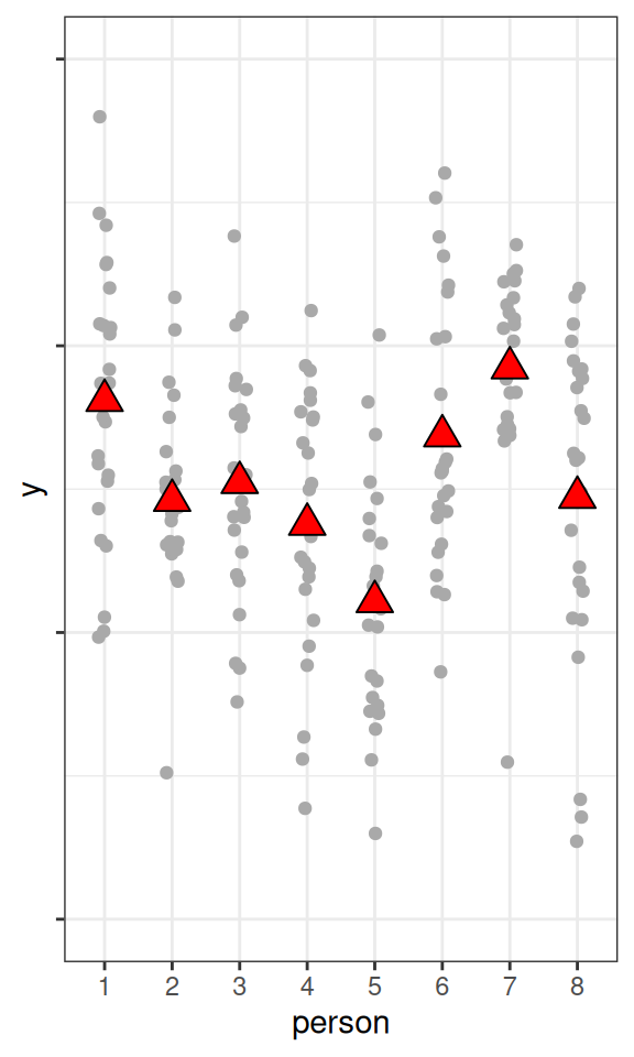 Finally, you can also allow \(\sigma\) to differ across individuals. This is typically used to relax the homogeneity of variance assumption, but recently, there has also been some interest in treating varying \(\sigma\) as an important outcome. Examples include fluctuations in mood, as two people with the same mean level of mood may fluctuate very differently, and mood swing can be an important outcome to assess. There have been some interesting applications in health research using ecological momentary assessment data. For an overview, see the paper by Hedeker et al. (2008).