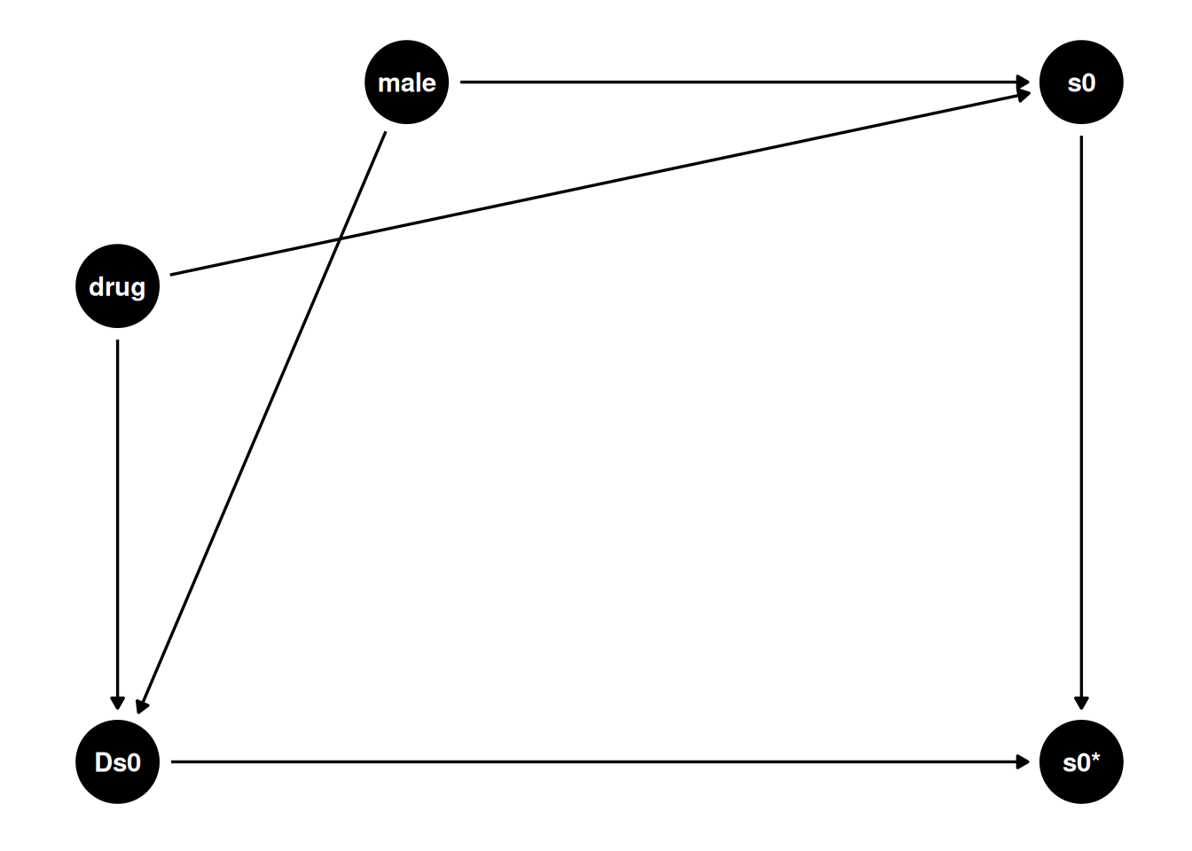 Let's consider this plausible DAG with `drug` and `male` predicting both `severe0` and its missingness (Ds0).